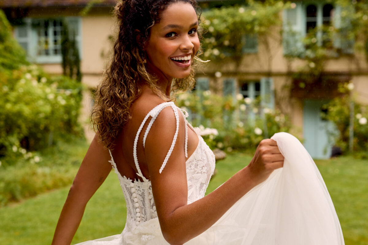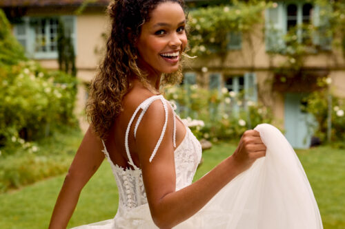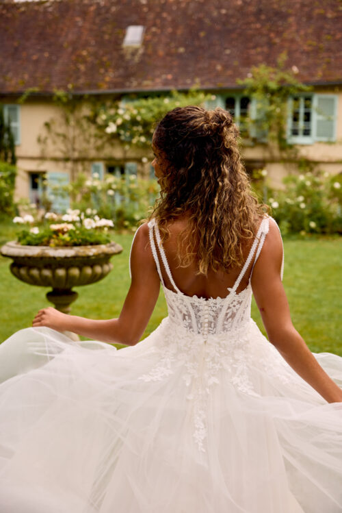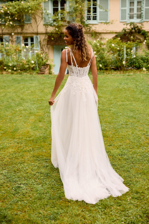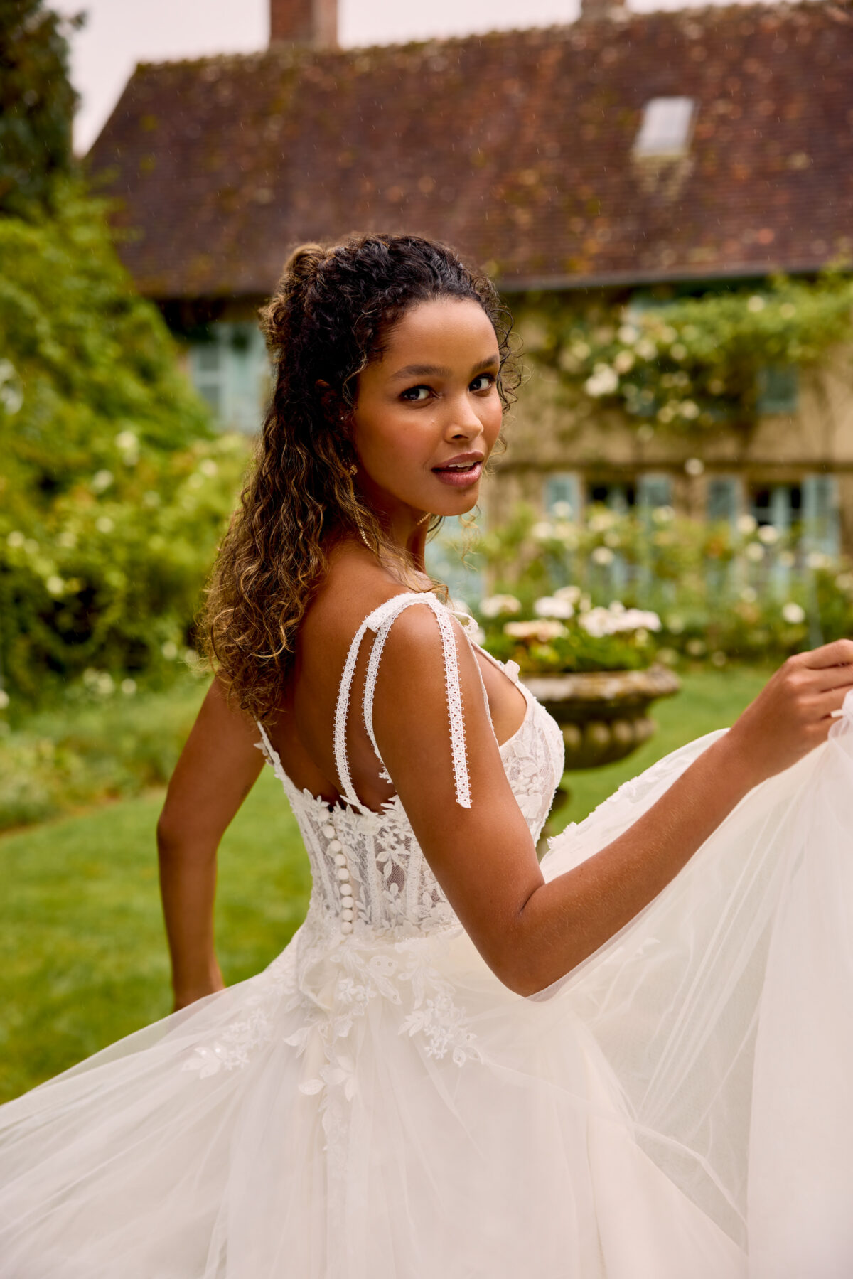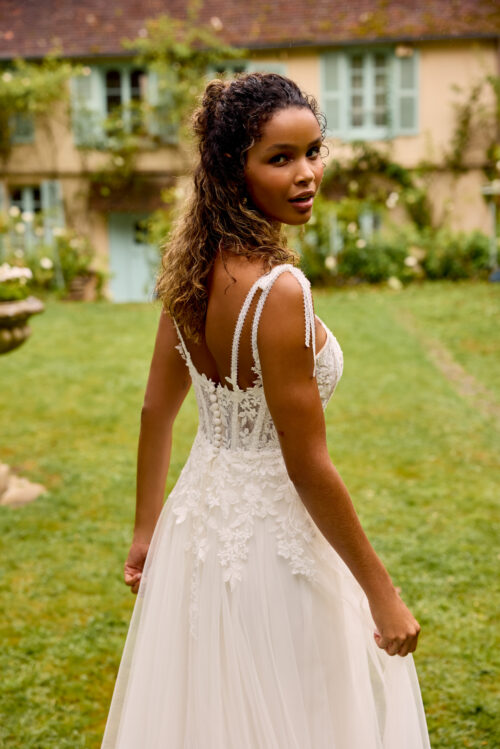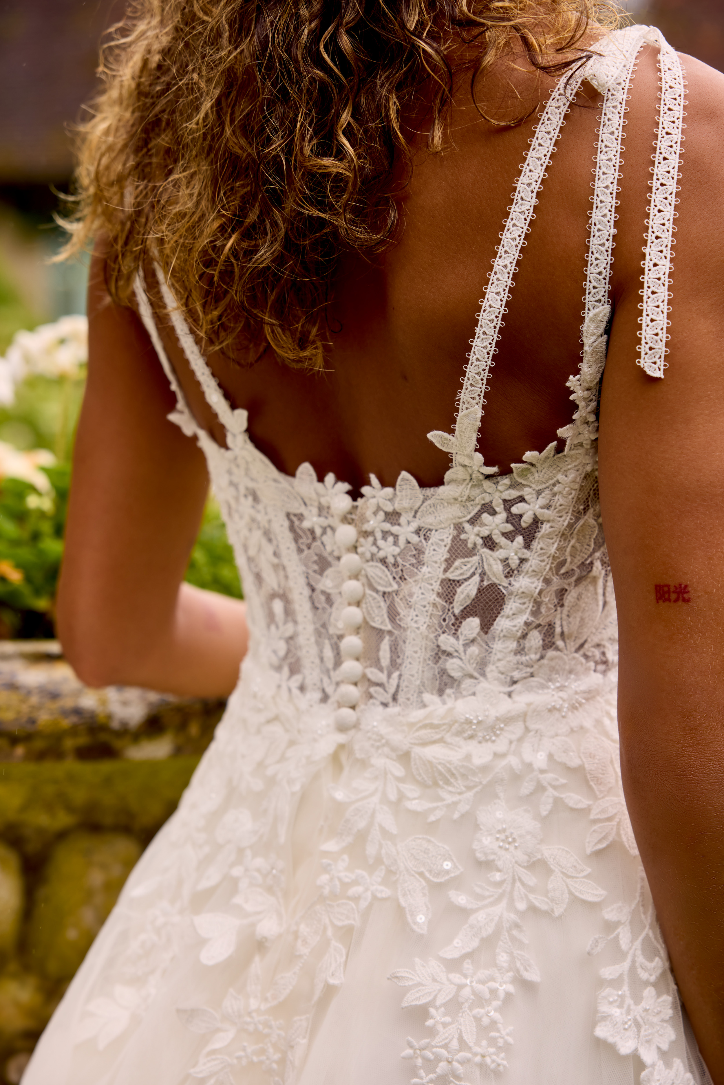 Το νυφικό 20051 είναι ένας ύμνος στη θηλυκότητα και τη ρομαντική πολυτέλεια. Το μπούστο του, διακοσμημένο με ανάγλυφη δαντέλα και λουλουδένια μοτίβα, συνδυάζει τη διαφάνεια του κορσέ με την απόλυτη αρμονία των λεπτομερειών. Οι διπλές τιράντες από φίνα δαντέλα προσθέτουν μοντέρνα πινελιά, ενώ η ανοιχτή πλάτη με σειρά επενδεδυμένων κουμπιών χαρίζει φίνο φινάλε.