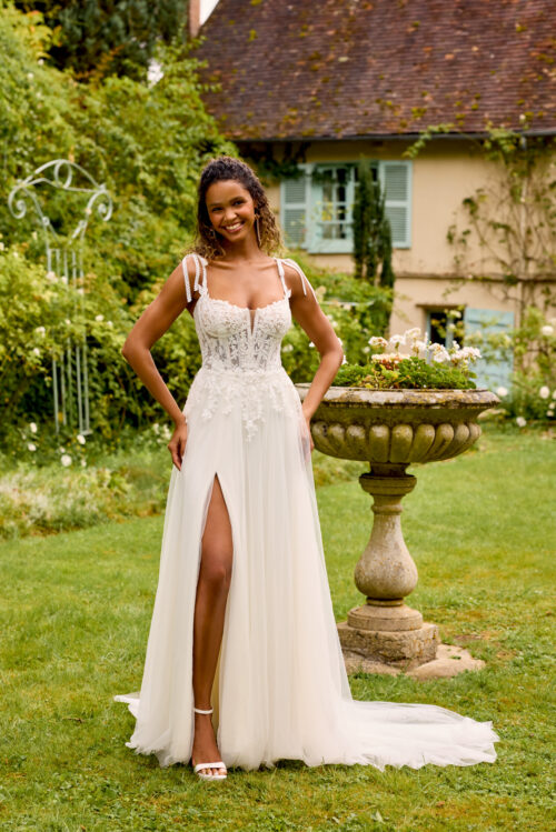 Ένα νυφικό που συνδυάζει το ρομαντικό στοιχείο με τη σύγχρονη αισθητική — ιδανικό για τη νύφη που θέλει να εντυπωσιάσει με λεπτότητα και χάρη.