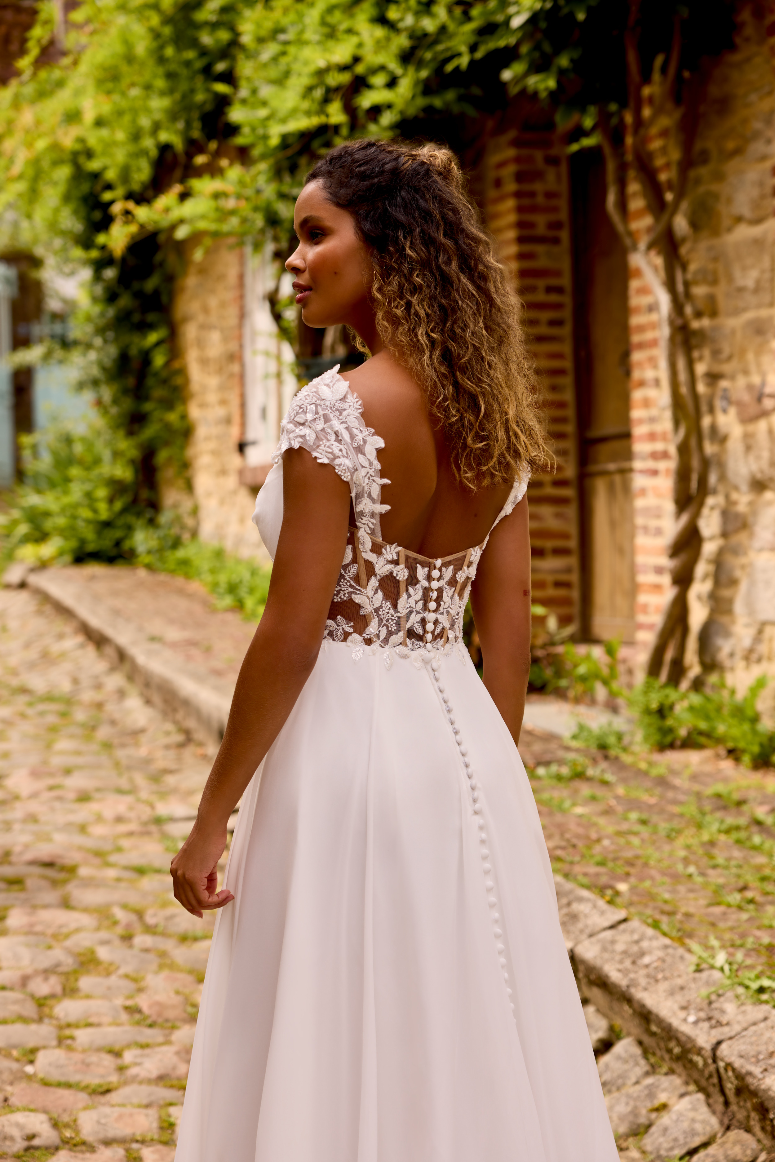✨ Λεπτομέρειες: Κεντημένοι ώμοι, illusion πλάτη με κουμπιά, ουρά chapel