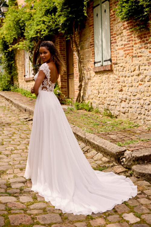 Η ανοιχτή illusion πλάτη με κεντημένες δαντελένιες λεπτομέρειες και διακριτικά κουμπιά προσθέτει θηλυκότητα, ενώ η φούστα A-line από ανάλαφρο chiffon χαρίζει αρμονική κίνηση και ροή σε κάθε βήμα. Η ουρά ολοκληρώνει τη ρομαντική αίσθηση με διακριτική χάρη.