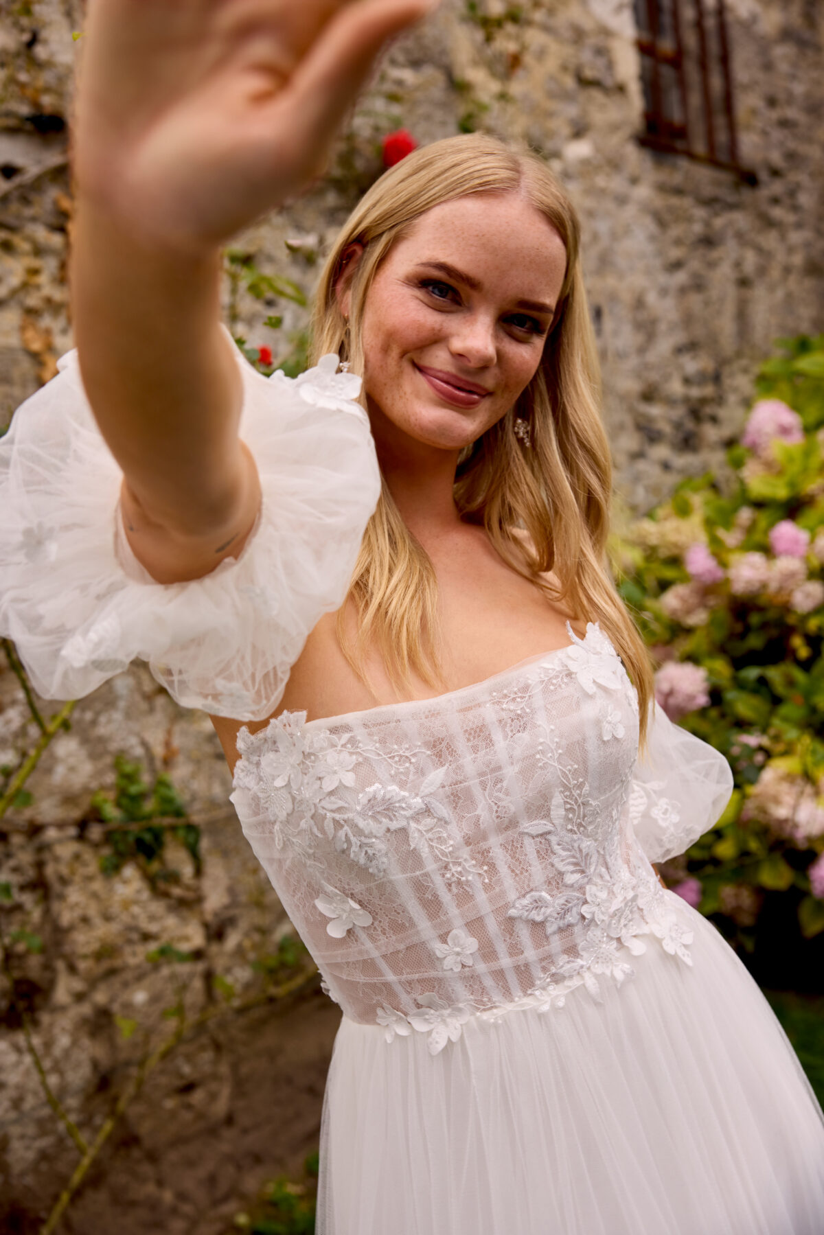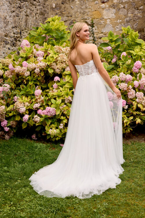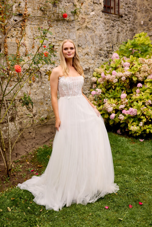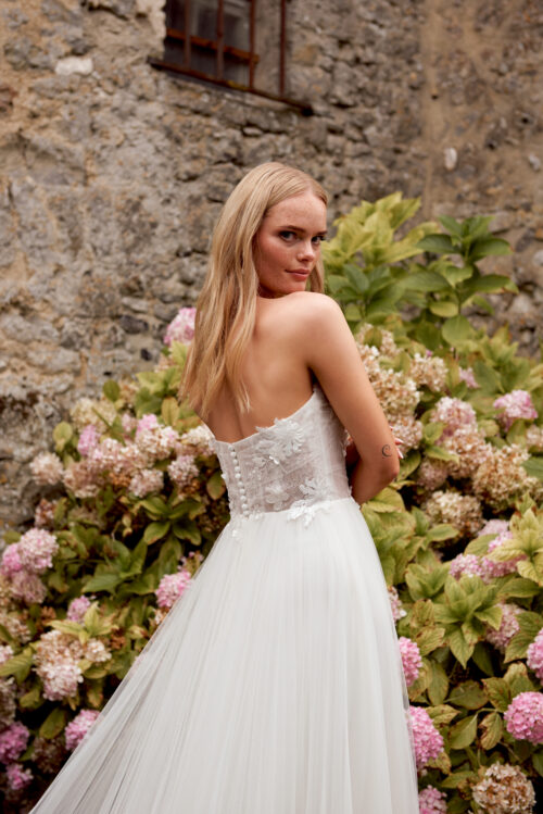 Το 20061 είναι ένα ρομαντικό strapless νυφικό σε γραμμή A-line, φτιαγμένο από απαλό τούλι που δημιουργεί αέρινη, αιθέρια κίνηση. Το κορσάζ είναι διακοσμημένο με 3D λουλουδένια δαντέλα και διακριτική γεωμετρική υφή, ενώ η ημιδιάφανη δομή του προσδίδει έναν εκλεπτυσμένο, σύγχρονο χαρακτήρα.