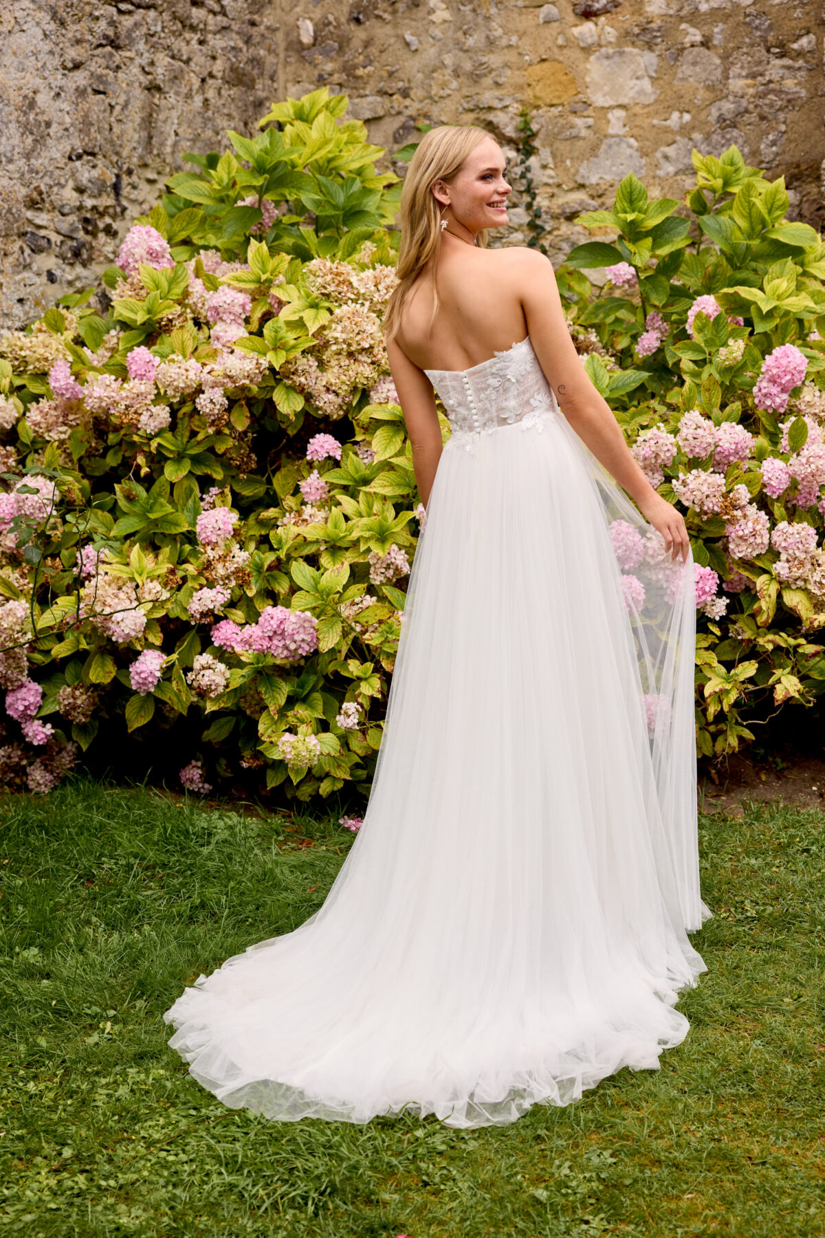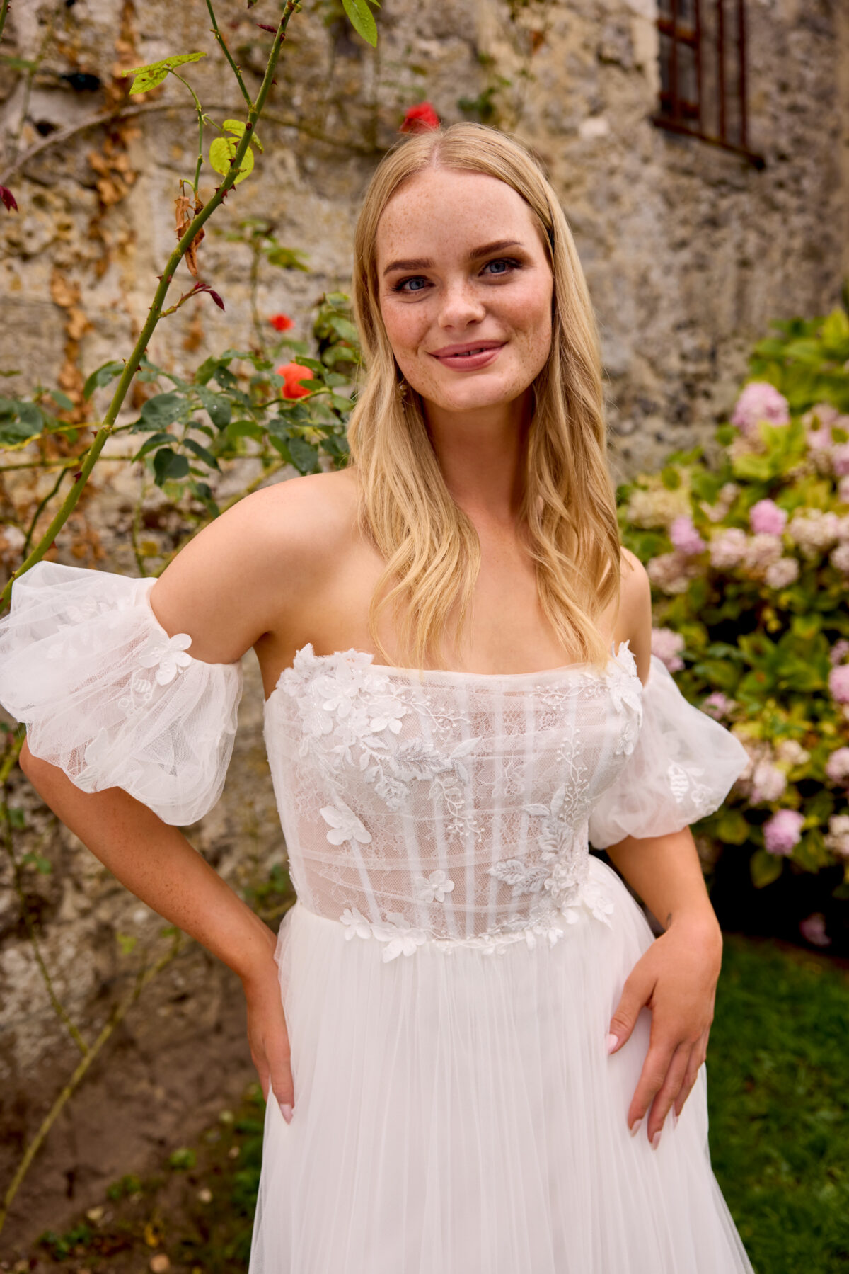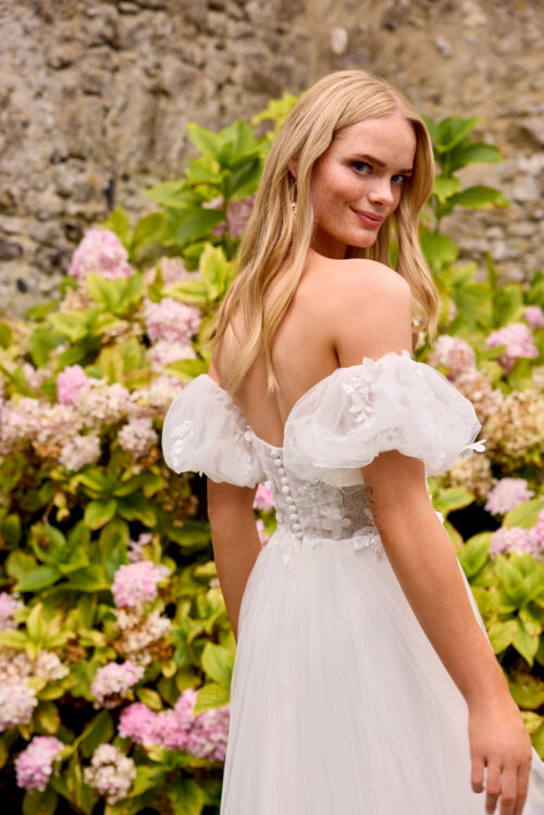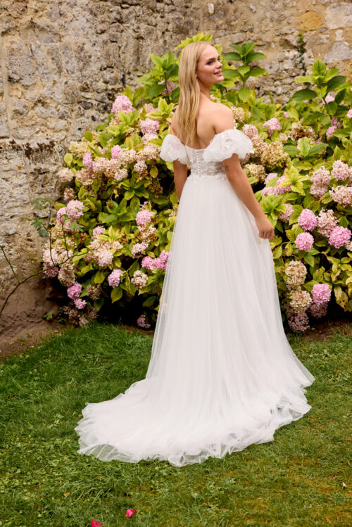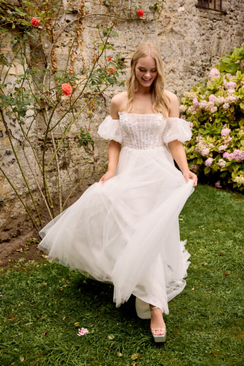 Η φούστα από πολλαπλές στρώσεις τούλι αγκαλιάζει απαλά τη σιλουέτα και ρέει ανάλαφρα, χαρίζοντας φυσική κομψότητα. Τα αποσπώμενα puff μανίκια off-shoulder προσθέτουν έναν παιχνιδιάρικο και ρομαντικό τόνο, επιτρέποντας δύο διαφορετικές εμφανίσεις — μία κλασική strapless και μία με vintage αισθητική.