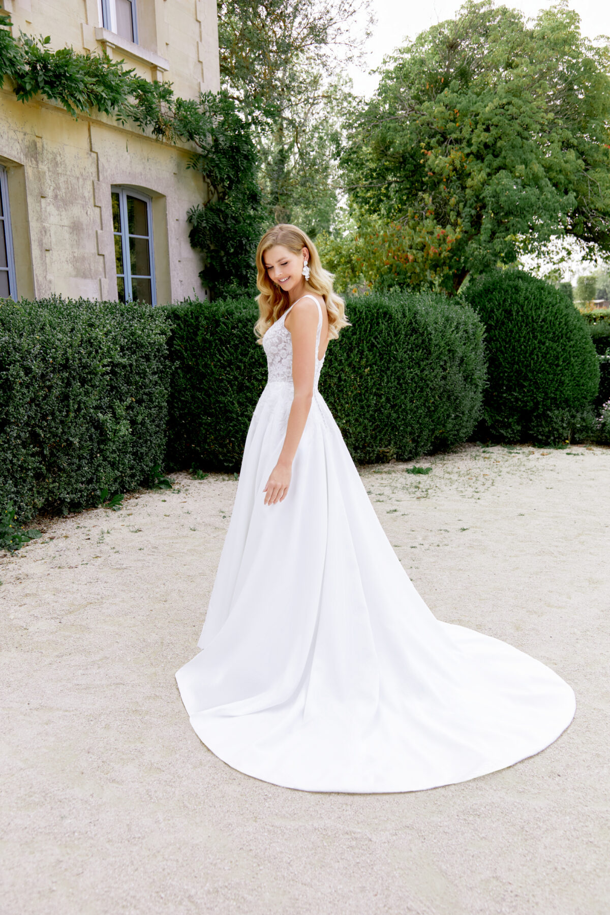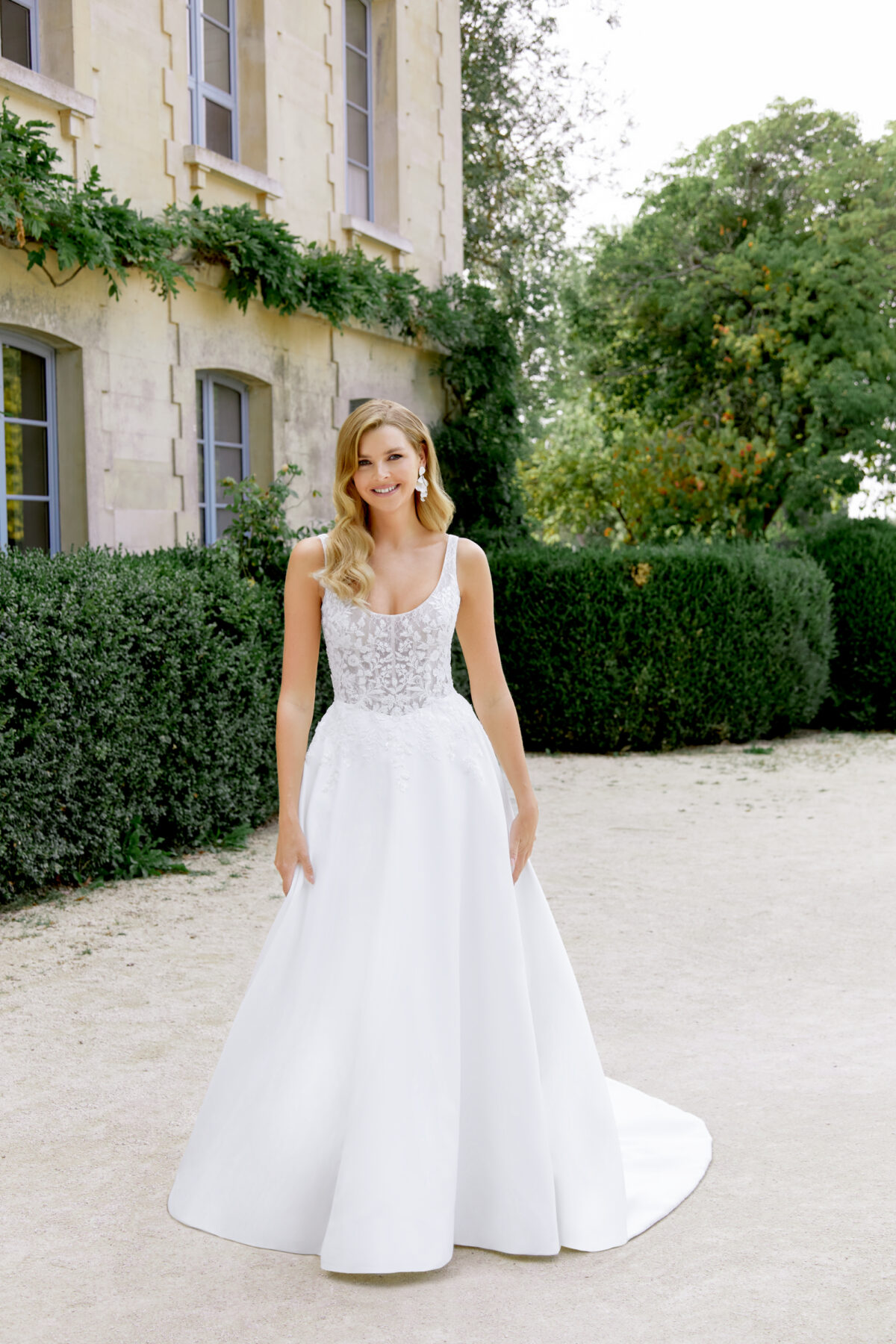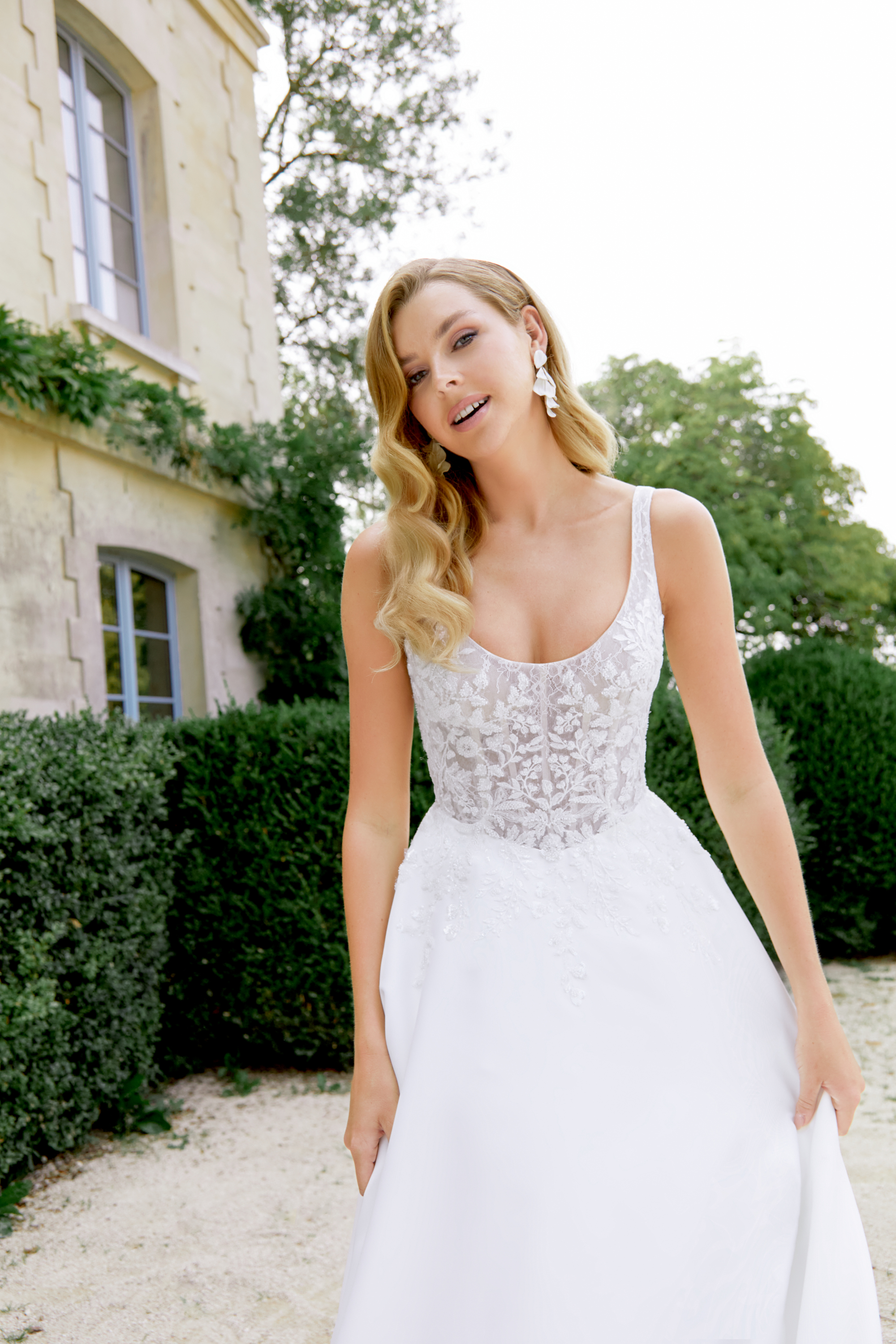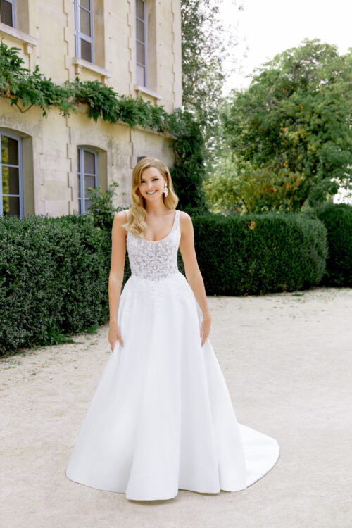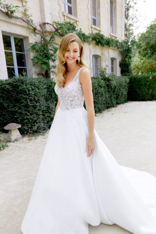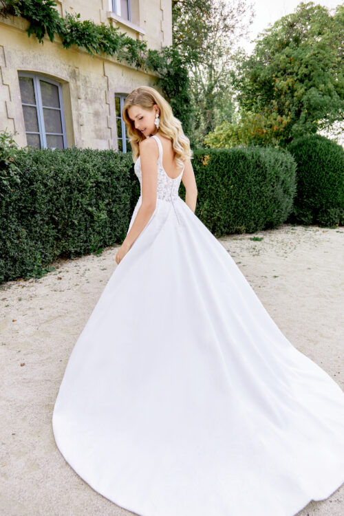 Το 44517 είναι ένα νυφικό που συνδυάζει την αριστοκρατική λάμψη του σατέν με τη ρομαντική γοητεία της δαντέλας. Η γραμμή Α-line χαρίζει ελευθερία κινήσεων και κολακεύει κάθε σιλουέτα, ενώ η βαθιά λαιμόκοψη και το κορσάζ μπούστο αναδεικνύουν τη θηλυκότητα με εκλεπτυσμένο τρόπο.