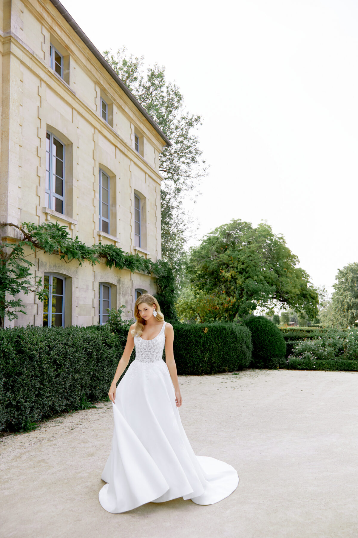 Το μπούστο στολίζεται με δαντελένια απλικέ με παγιέτες και χάντρες, πάνω σε στρώσεις από τούλι και Chantilly δαντέλα, δημιουργώντας φίνα λάμψη. Η φούστα από σατέν με λεπτομέρειες δαντέλας δίνει μια αίσθηση πολυτέλειας, ενώ η ουρά τύπου Chapel ολοκληρώνει το νυφικό με κομψό μεγαλείο.