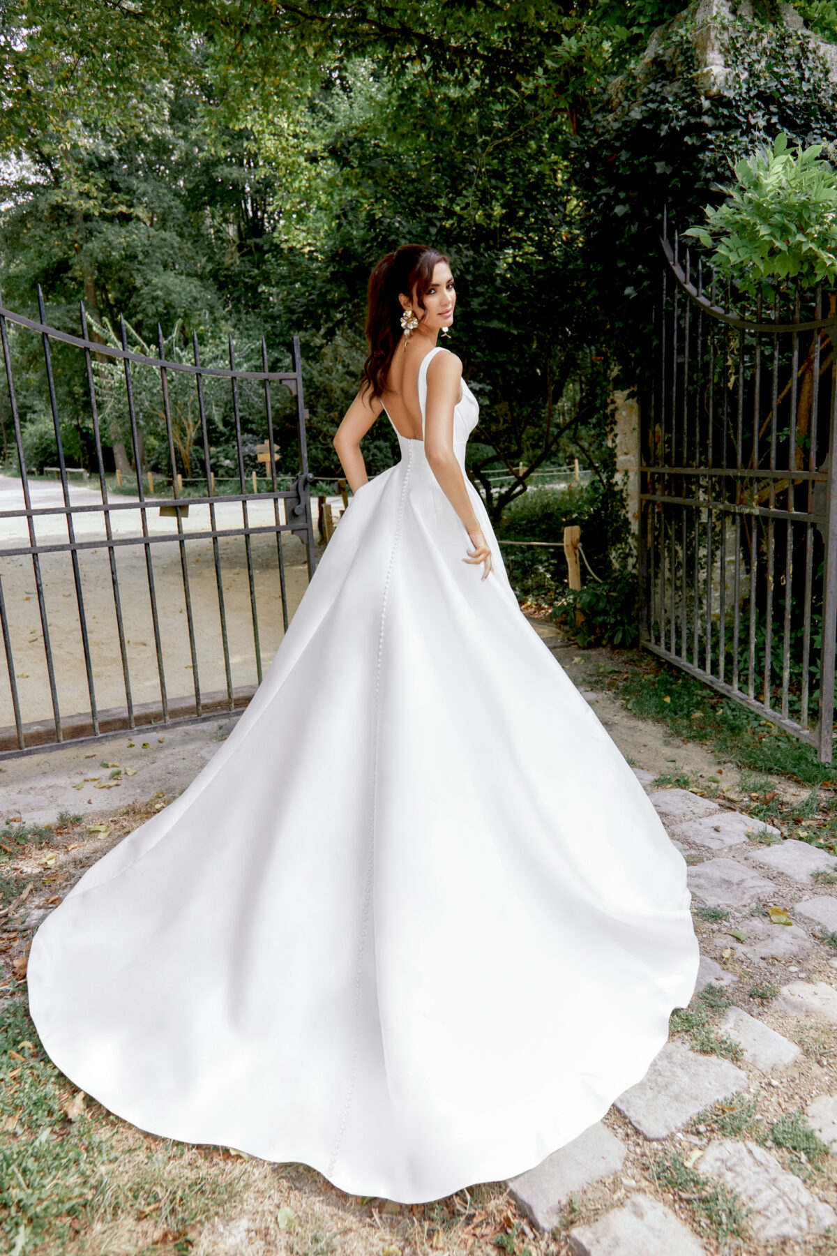Η ένθετη ζώνη στη μέση τονίζει με κομψότητα τη σιλουέτα, ενώ η λαιμόκοψη τύπου χαμόγελο (Sabrina) προσθέτει ρομαντισμό και αριστοκρατικό ύφος. Το πολυτελές ύφασμα από μετάξι Mikado δίνει στο νυφικό δομή και λαμπερή εμφάνιση, ενώ η ουρά τύπου Chapel ολοκληρώνει την εικόνα με εκλεπτυσμένο μεγαλείο.