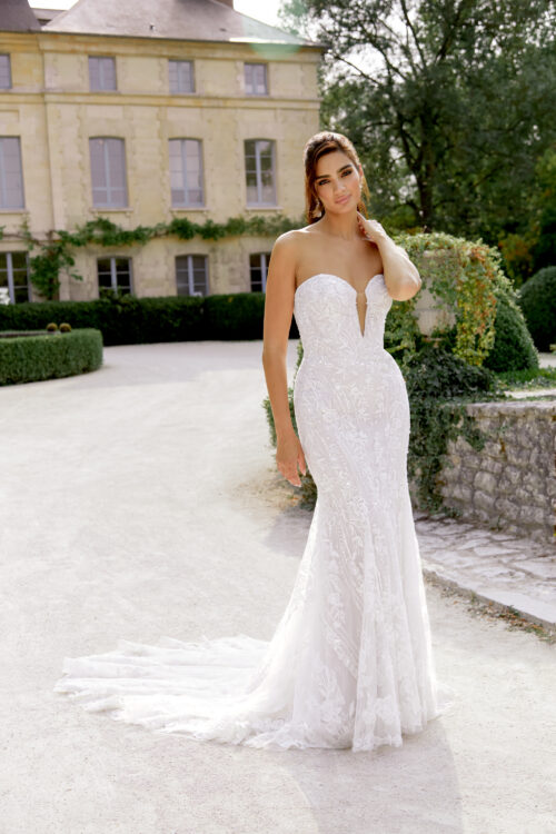 Το 44528 είναι ένα νυφικό που συνδυάζει τη θηλυκή κομψότητα με τη φίνα πολυτέλεια. Η γραμμή fit & flare αγκαλιάζει τις καμπύλες και ανοίγει κομψά στο κάτω μέρος, προσφέροντας χάρη σε κάθε βήμα. Το στράπλες μπούστο με illusion λεπτομέρεια στο κέντρο τονίζει το ντεκολτέ με εκλεπτυσμένο τρόπο.