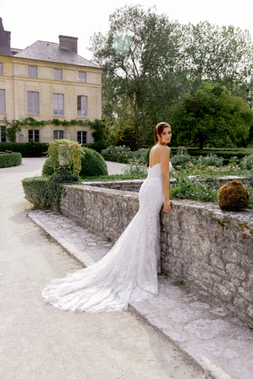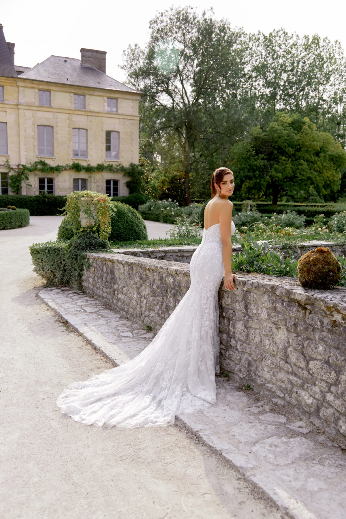 Η δαντέλα Chantilly με κεντήματα από χάντρες και παγιέτες προσθέτει λάμψη χωρίς υπερβολές, ενώ το διάφανο τούλι και οι προσεγμένες λεπτομέρειες δημιουργούν ένα γραφικό, μοντέρνο αποτέλεσμα. Η ουρά τύπου Chapel ολοκληρώνει την εμφάνιση με ρομαντική φινέτσα.