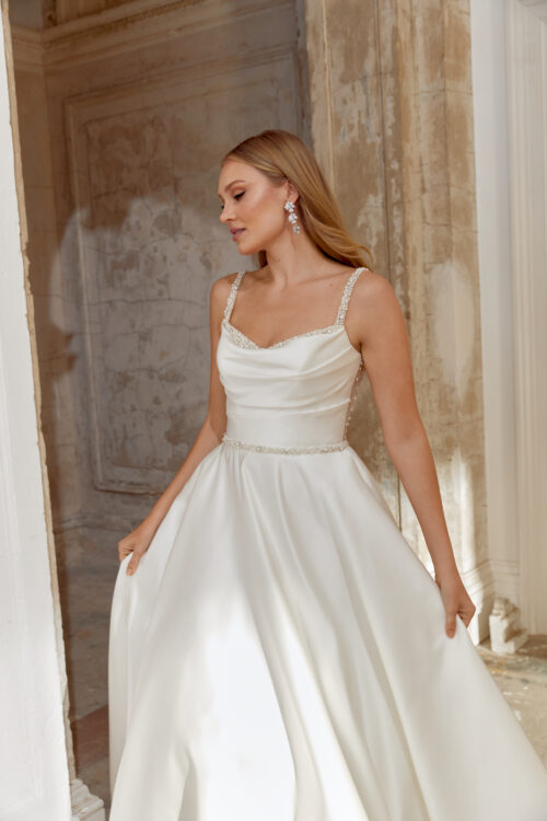 Το μπούστο με λεπτές τιράντες είναι διακοσμημένο με χειροποίητα κεντήματα και χάντρες, που δημιουργούν μια διακριτική λάμψη, ενώ η φούστα Mikado πέφτει σε μαλακές πτυχώσεις με δομή και όγκο. Η απόχρωση Ivory/Silver/Latte προσφέρει βάθος και ζεστασιά, ενώ η ουρά τύπου Chapel ολοκληρώνει το νυφικό με ρομαντική μεγαλοπρέπεια.