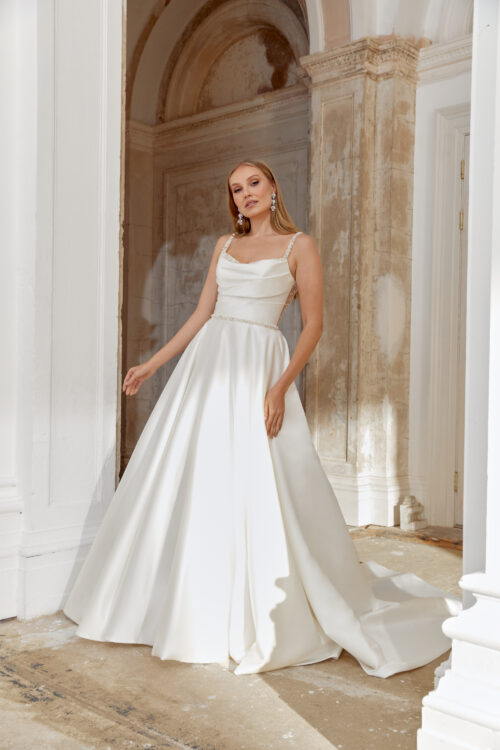 Το 44549 είναι ένα διαχρονικά κομψό νυφικό που συνδυάζει τη δομή του Mikado με τη ρομαντική λεπτομέρεια της κεντημένης λαιμόκοψης σε σχήμα καρδιάς. Η γραμμή A-line αγκαλιάζει απαλά τη σιλουέτα, προσφέροντας κίνηση και θηλυκή φινέτσα.