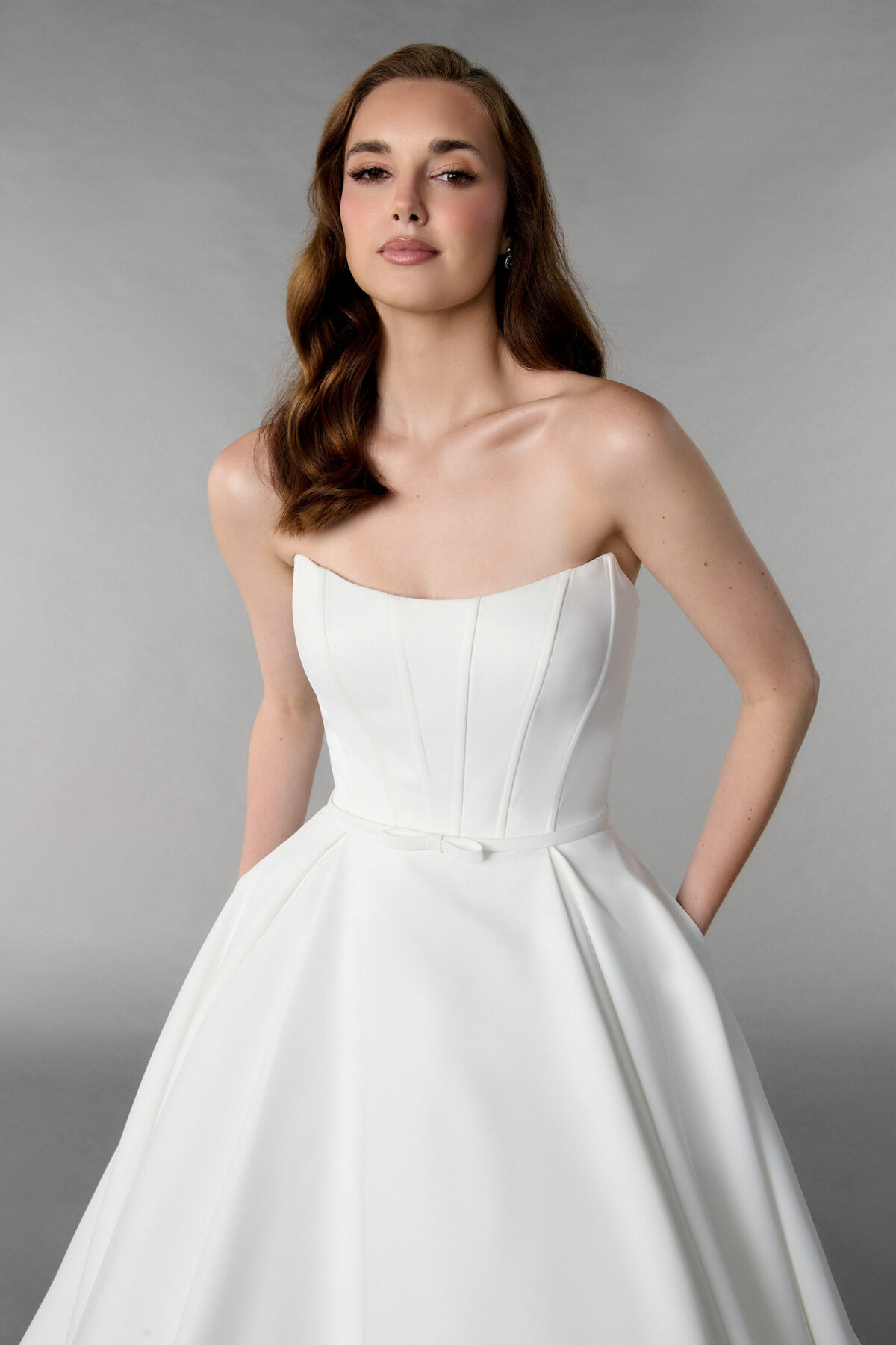 Το 55221 είναι ένα εντυπωσιακό νυφικό σε ball gown γραμμή από πολυτελές ύφασμα Mikado, που συνδυάζει τη δομή με τη διαχρονική κομψότητα. Το strapless μπούστο διαθέτει εμφανή ραφή κορσέ που αναδεικνύει τη σιλουέτα, ενώ η λεπτή ζώνη με φινετσάτο φιόγκο τονίζει αρμονικά τη μέση.