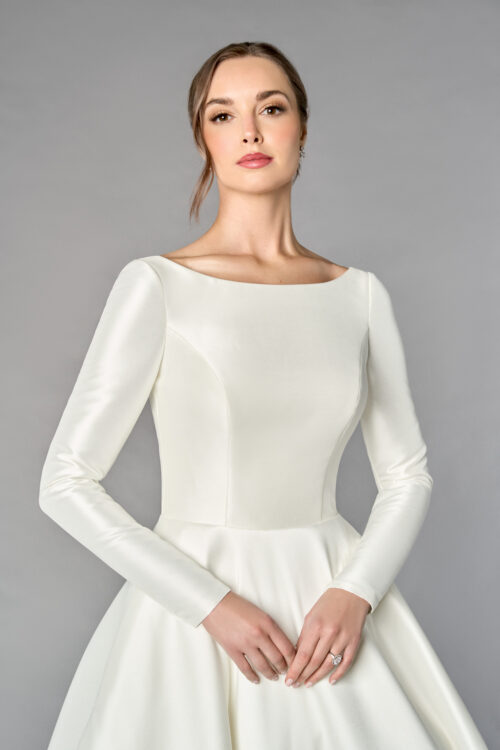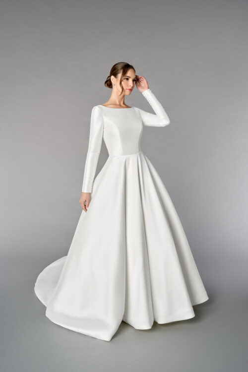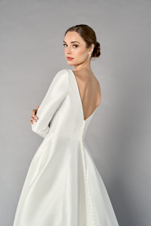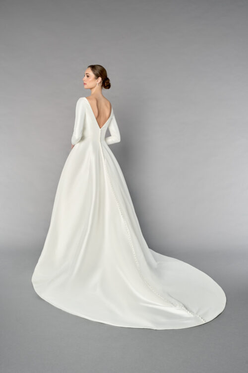 Το 55253 είναι ένα εκλεπτυσμένο και διαχρονικό νυφικό σε γραμμή A-line, φτιαγμένο από πολυτελές ύφασμα Mikado, που προσδίδει δομή και αρχοντική απλότητα. Η Sabrina λαιμόκοψη και τα μακριά μανίκια χαρίζουν μια αριστοκρατική αίσθηση, ενώ τα κουμπιά στους καρπούς προσθέτουν διακριτική ραπτική λεπτομέρεια.