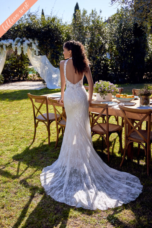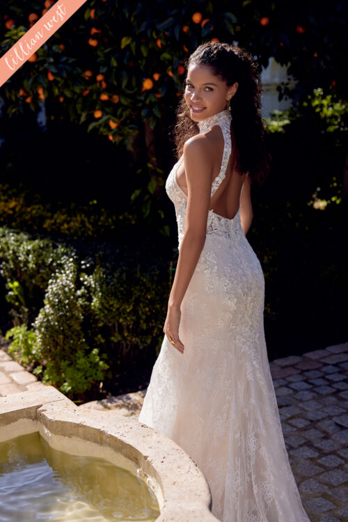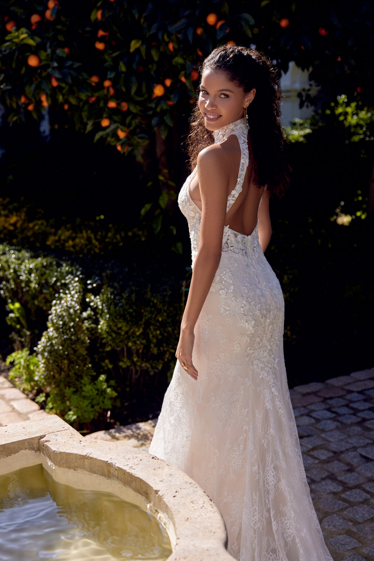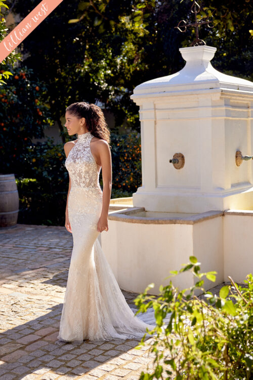Η κλειστή πλάτη ενισχύει τη ραπτική του ισορροπία, δημιουργώντας ένα look που συνδυάζει σεμνότητα και γοητεία. Το νυφικό είναι εξολοκλήρου διακοσμημένο με δαντέλα και λεπτές παγιέτες, που προσθέτουν φίνα λάμψη, ενώ το jersey ύφασμα εξασφαλίζει τέλεια εφαρμογή και άνεση. Οι αποχρώσεις Sand/Ivory/Latte ή Ivory/Ivory/Latte προσδίδουν βάθος και διακριτική θερμότητα στην εμφάνιση.