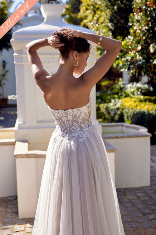 Η φούστα από τούλι στολίζεται με τρισδιάστατα δαντελένια απλικέ και λεπτές παγιέτες, δημιουργώντας μια ονειρική λάμψη σε κάθε κίνηση. Στο πίσω μέρος, το δέσιμο με κορδόνια προσθέτει ρομαντική λεπτομέρεια και τέλεια εφαρμογή. Οι αποχρώσεις Nude/Ivory/Latte και Ivory/Ivory/Latte αναδεικνύουν τη ρομαντική υφή του σχεδίου.