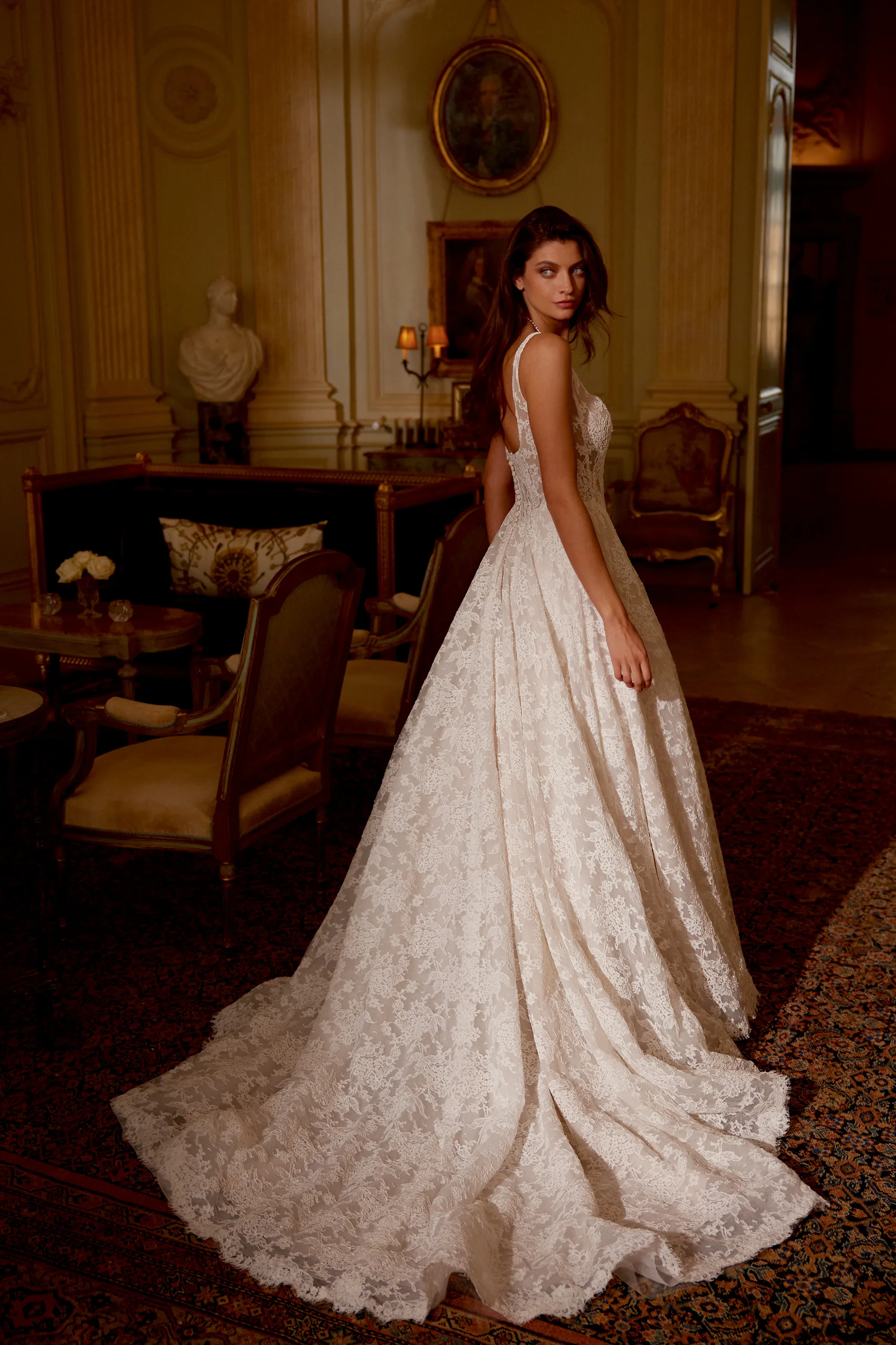 Το νυφικό 88423 είναι η επιτομή της διαχρονικής πολυτέλειας, σχεδιασμένο για τη νύφη που θέλει να συνδυάσει αρχοντική κομψότητα με αισθησιακές λεπτομέρειες. Ολόκληρο το φόρεμα είναι ντυμένο με φίνα floral δαντέλα, δημιουργώντας ένα πλούσιο αλλά απόλυτα εκλεπτυσμένο αποτέλεσμα.