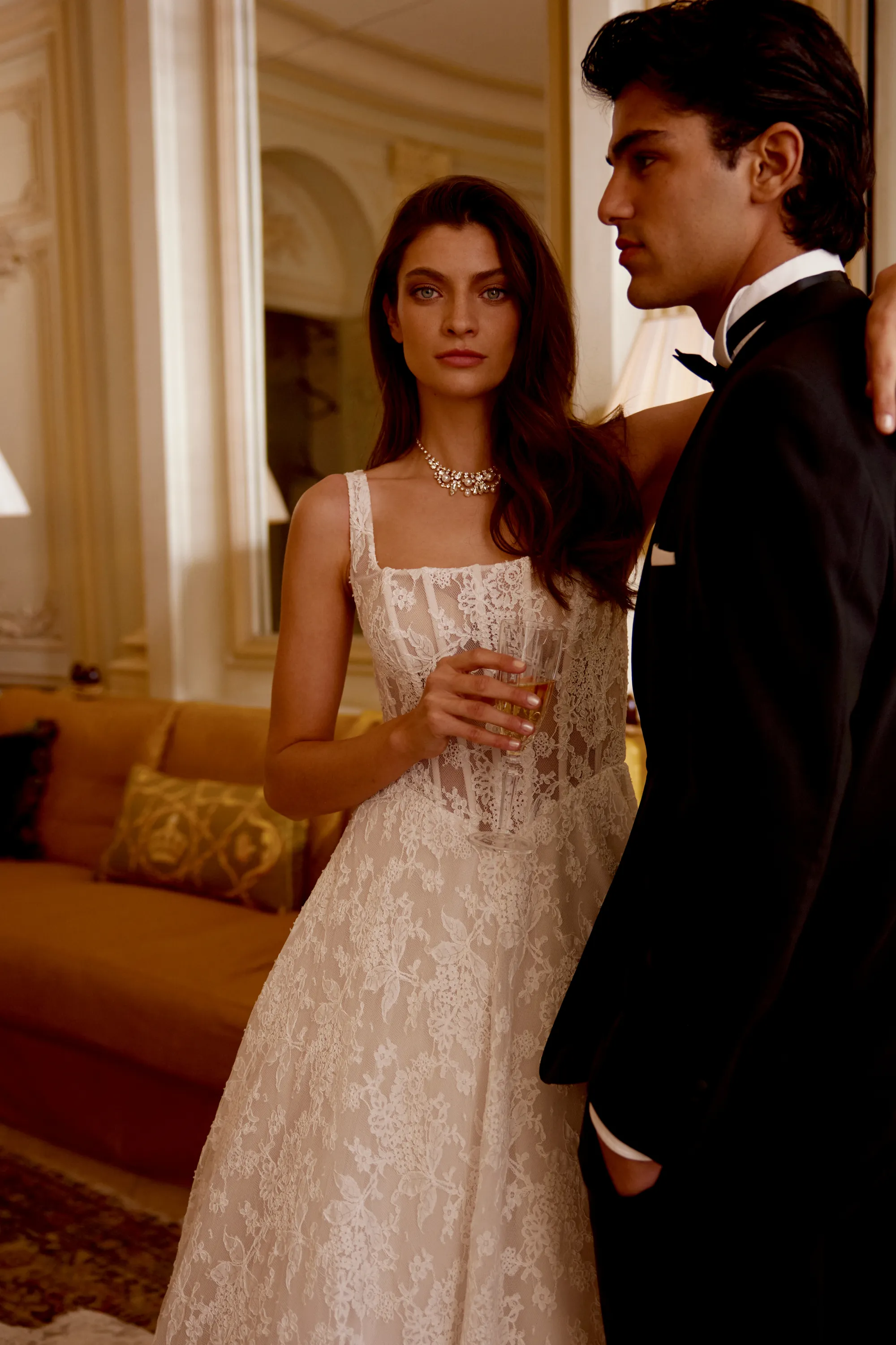 Το μπούστο τύπου corset με εμφανή δομή αναδεικνύει τη σιλουέτα και προσφέρει άψογη εφαρμογή, ενώ οι λεπτές τιράντες και το βαθύ άνοιγμα στην πλάτη προσθέτουν θηλυκότητα χωρίς υπερβολή. Η φούστα A-line ανοίγει αρμονικά από τη μέση και καταλήγει σε εντυπωσιακή ουρά, χαρίζοντας κίνηση και βασιλικό χαρακτήρα σε κάθε βήμα.