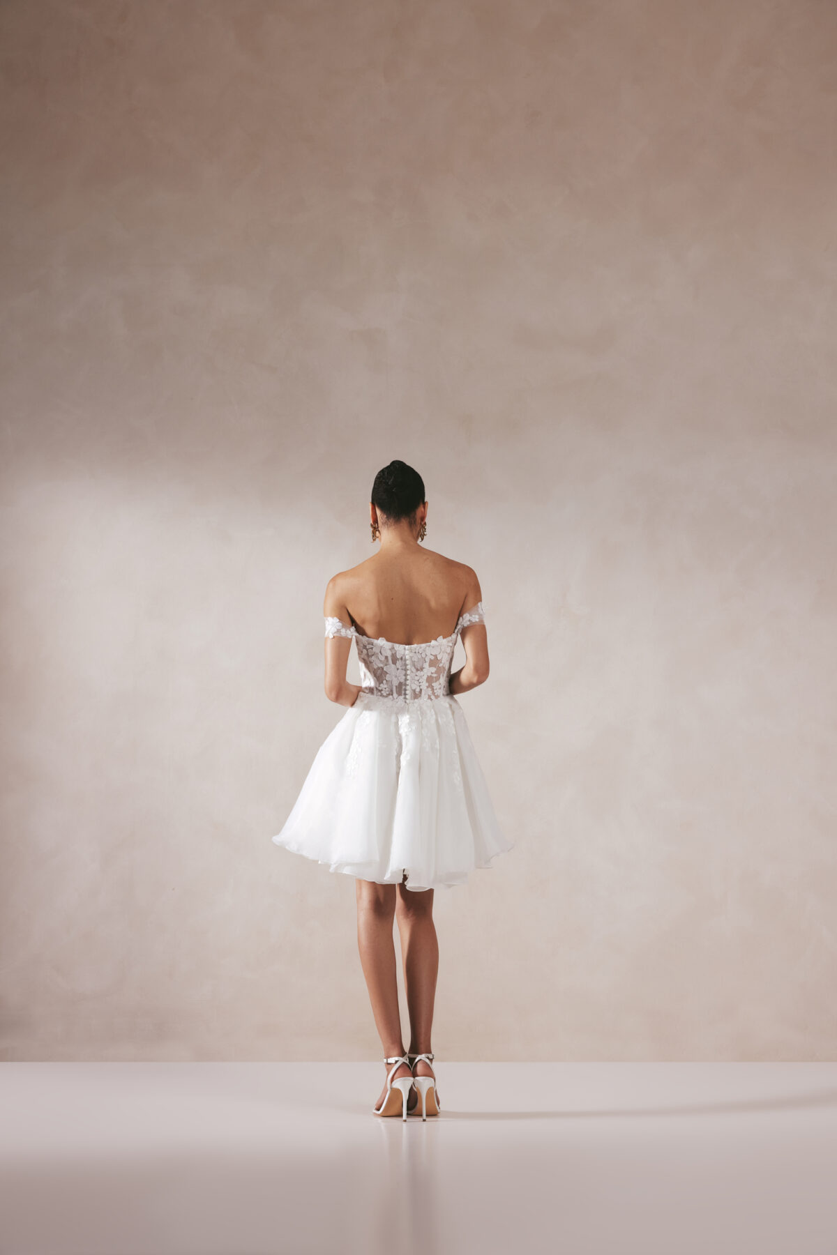 Το Aria είναι ένα παιχνιδιάρικο και ρομαντικό μίνι νυφικό που συνδυάζει τη φρεσκάδα με την υψηλή ραπτική. Η γραμμή A-line mini χαρίζει νεανική κομψότητα, ενώ η sweetheart λαιμόκοψη με off-shoulder διάθεση τονίζει θηλυκά το μπούστο.