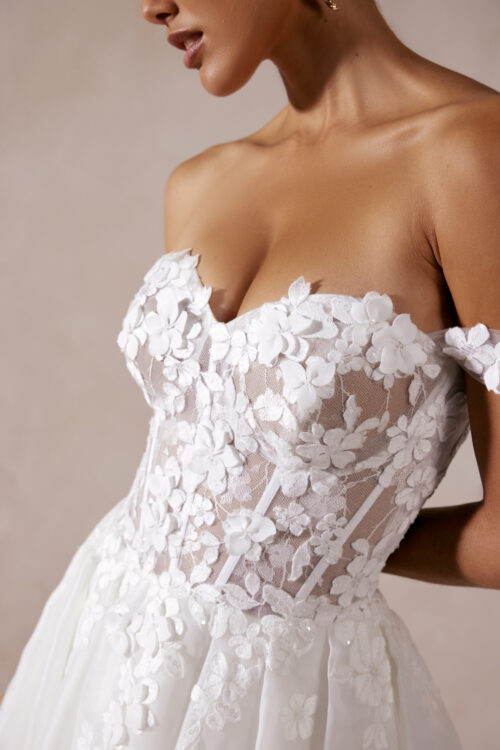 Το μπούστο είναι ενισχυμένο με κορσέ boning και διακοσμημένο με τρισδιάστατα λουλούδια, δαντελένια απλικέ και παγιέτες, προσφέροντας φίνα λάμψη. Η φούστα από οργάντζα και τούλι δημιουργεί ανάλαφρο όγκο, δίνοντας αέρινη αίσθηση σε κάθε κίνηση. Το Aria διαθέτει και αποσπώμενες τιράντες για επιπλέον ευελιξία στο στυλ.