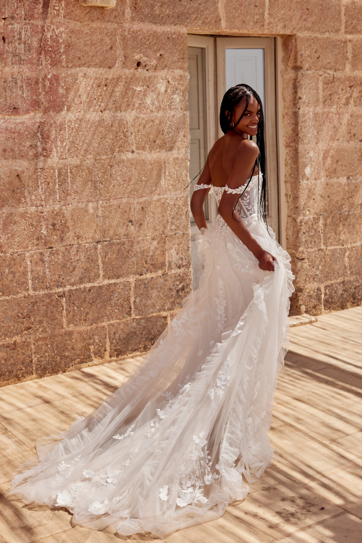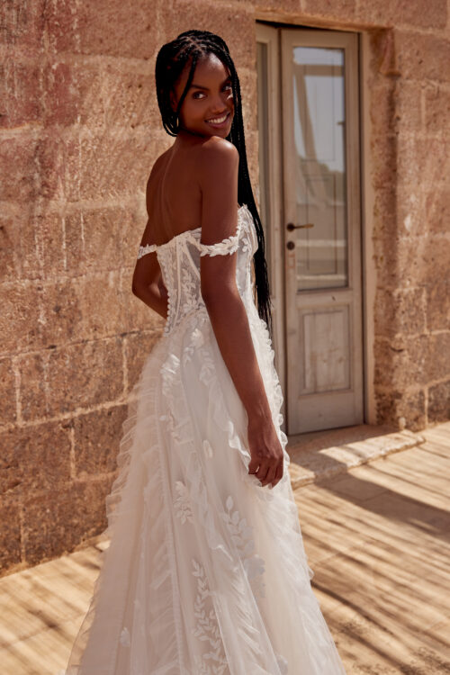 Η φούστα από English Net (αγγλικό δίχτυ) και πλούσια layers από τούλι και βολάν, στολισμένη με δαντελένια απλικέ με παγιέτες, δημιουργεί αέρινη κίνηση και διακριτική λάμψη. Η ουρά τύπου Chapel ολοκληρώνει την εικόνα με ρομαντική φινέτσα, ιδανική για την πιο ξεχωριστή είσοδο.