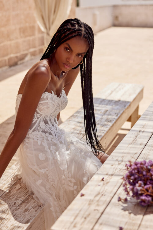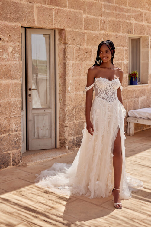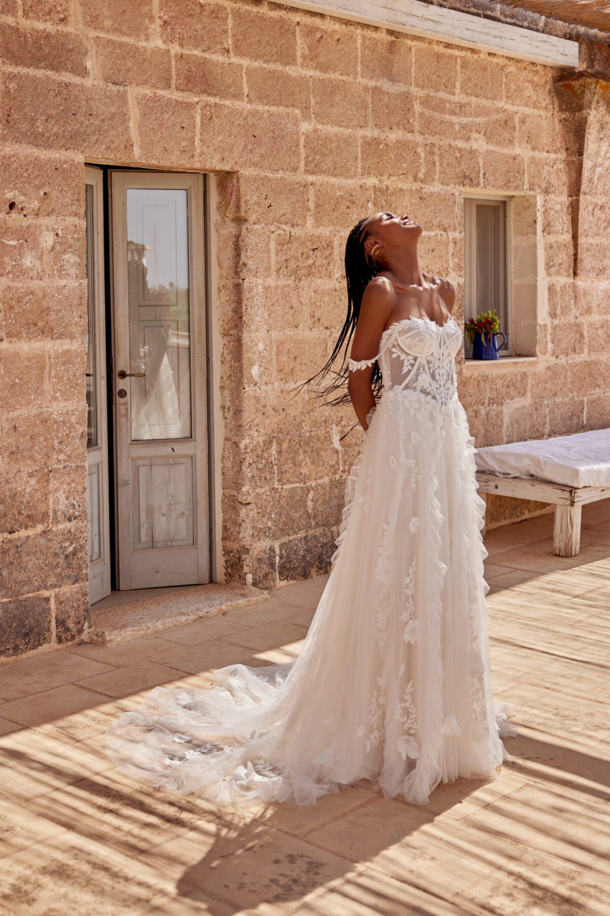 Ένα νυφικό που ισορροπεί ανάμεσα στην αέρινη ρομαντικότητα και τη δομημένη κομψότητα, ιδανικό για τη νύφη που ονειρεύεται μια εμφάνιση γεμάτη φως και χάρη.