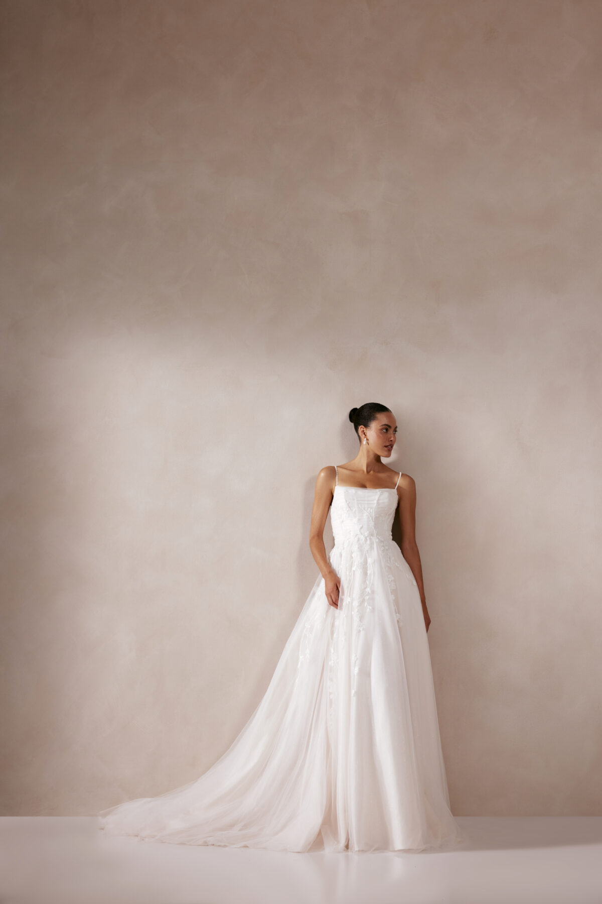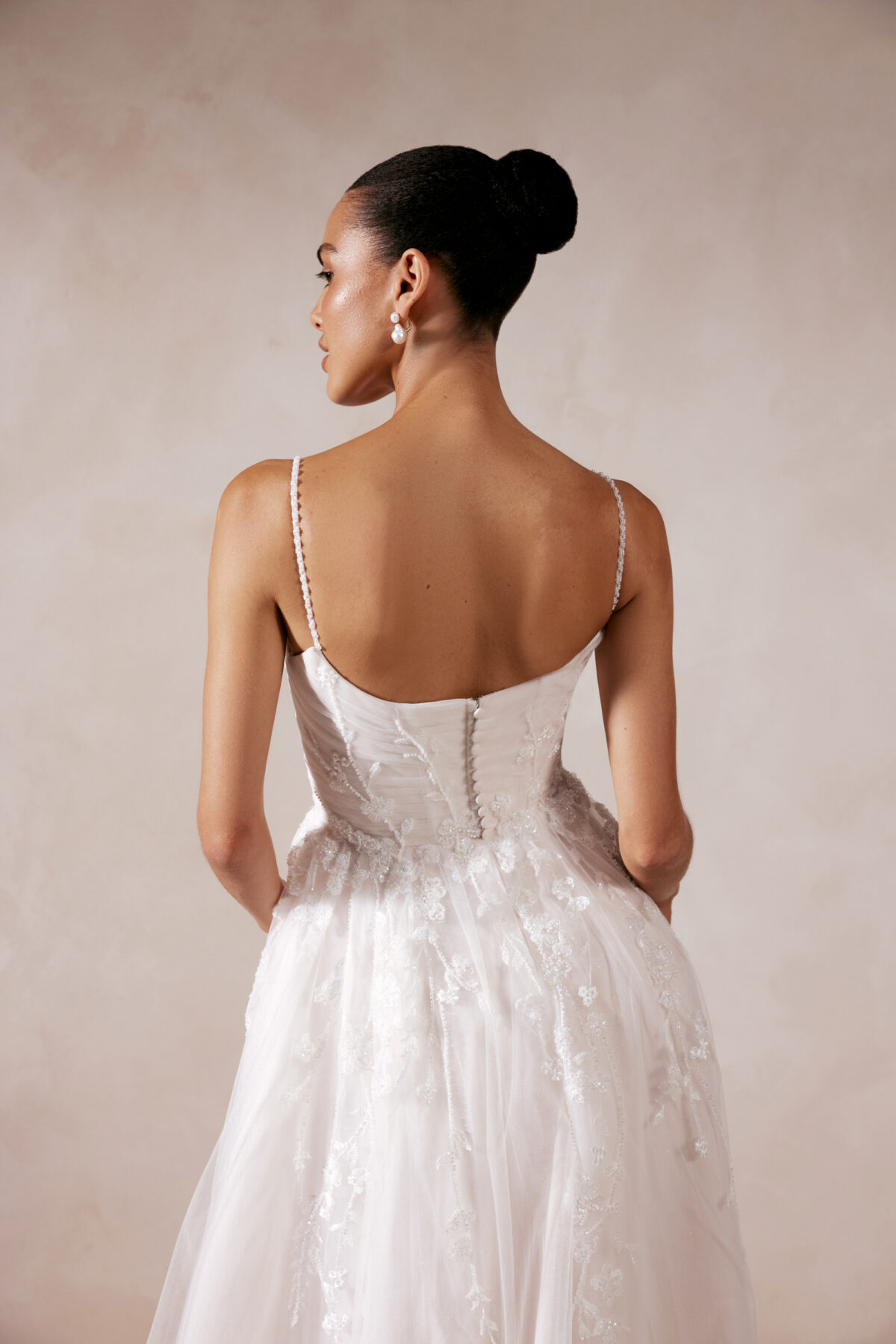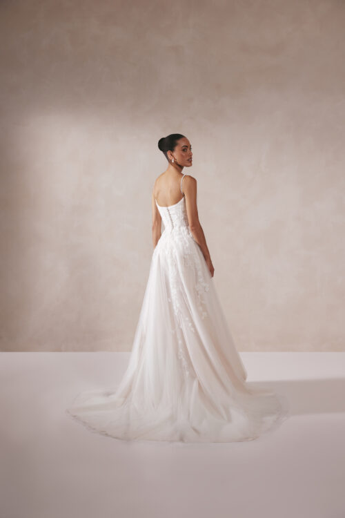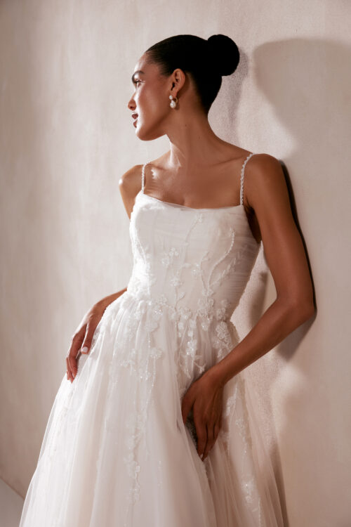 Οι τιράντες με χάντρες και πέρλες προσθέτουν φίνα λάμψη, ενώ το κορσάζ και η φούστα στολίζονται με κεντήματα δαντέλας με παγιέτες και glitter tulle, δημιουργώντας μαγευτικά παιχνιδίσματα φωτός. Η ουρά τύπου Chapel ολοκληρώνει την εμφάνιση με ρομαντική μεγαλοπρέπεια.