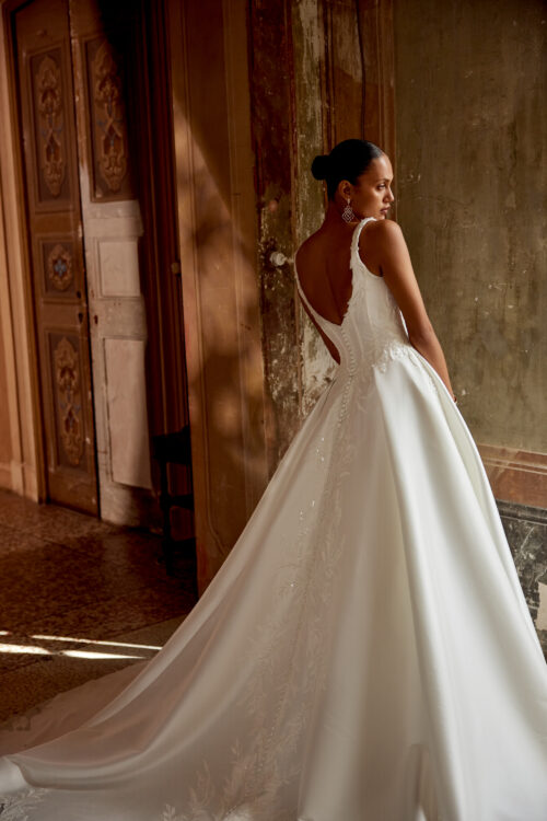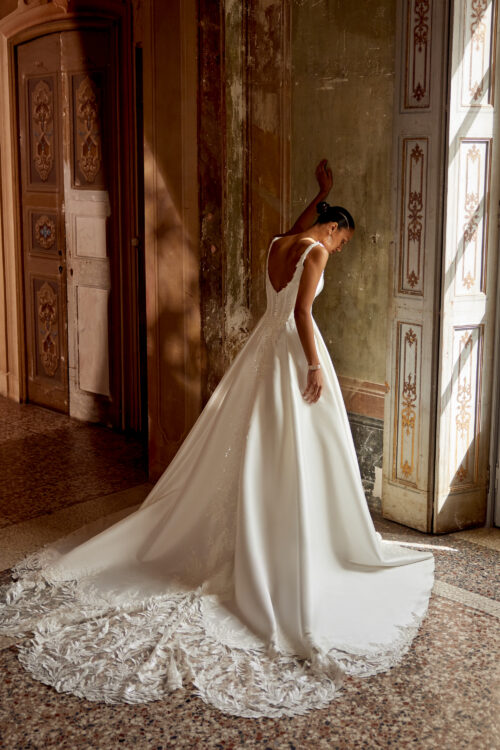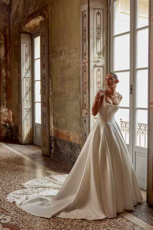 Η τετράγωνη λαιμόκοψη (square neckline) προσδίδει μια μοντέρνα αλλά και διαχρονική αισθητική, ενώ τα δαντελένια μοτίβα με παγιέτες στο μπούστο και τη φούστα προσθέτουν μια διακριτική λάμψη. Η φούστα από πολυτελές Stretch Mikado ολοκληρώνεται με ουρά τύπου Cathedral, χαρίζοντας δραματικότητα και βασιλικό μεγαλείο σε κάθε βήμα.