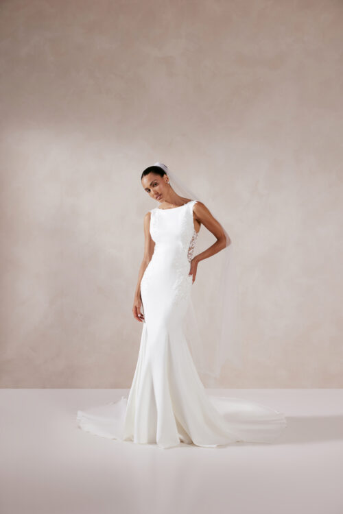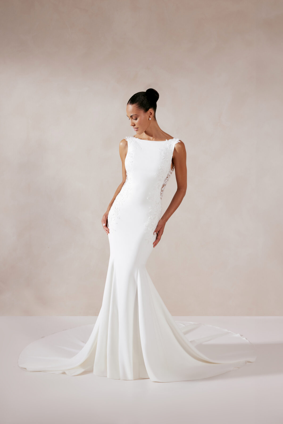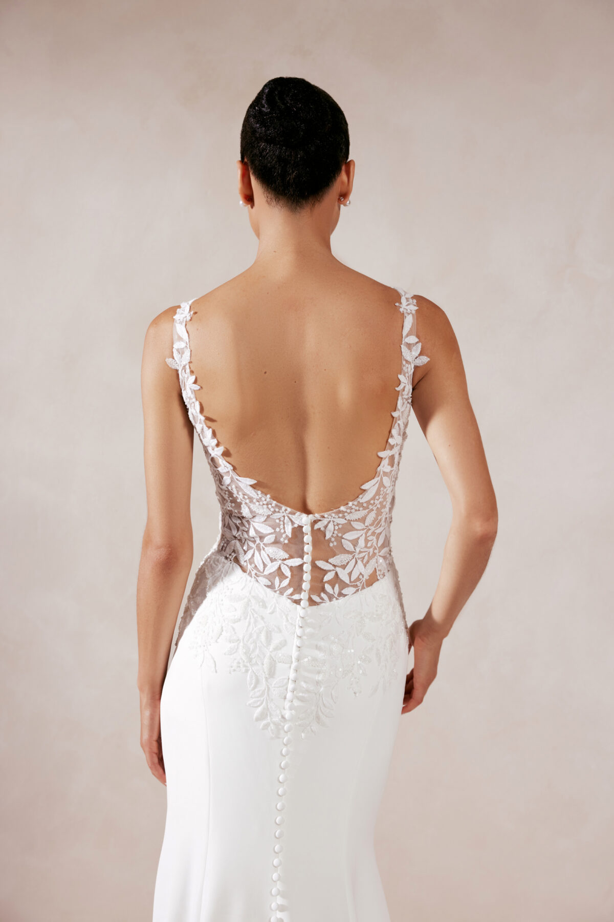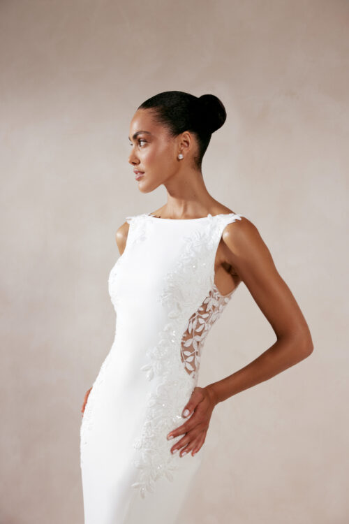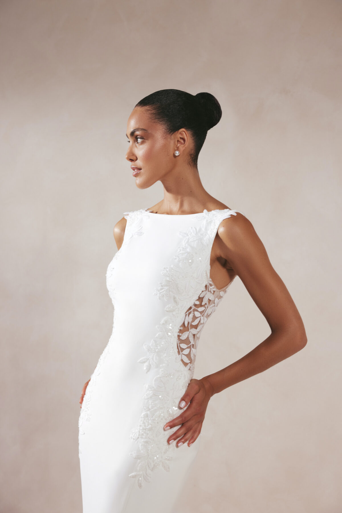 Το Lanie είναι ένα νυφικό που συνδυάζει διακριτική κομψότητα με σύγχρονη θηλυκότητα. Ραμμένο από πολυτελές ελαστικό κρεπ, αγκαλιάζει αρμονικά τη σιλουέτα, αναδεικνύοντας τη χάρη του σώματος. Η λαιμόκοψη τύπου Σαμπρίνα (χαμόγελο) δίνει μια αέρινη και ρομαντική αίσθηση, ενώ οι λεπτομέρειες από κεντημένη δαντέλα με παγιέτες και χάντρες χαρίζουν μια διακριτική λάμψη σε κάθε κίνηση.