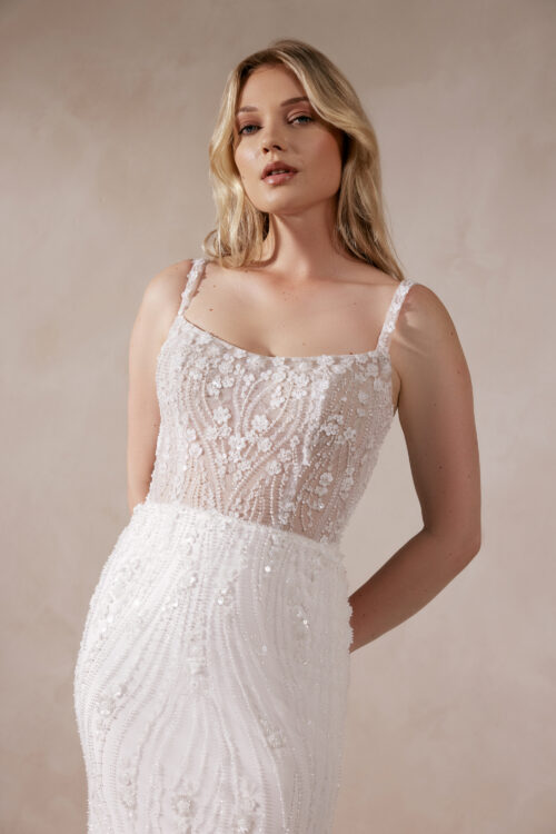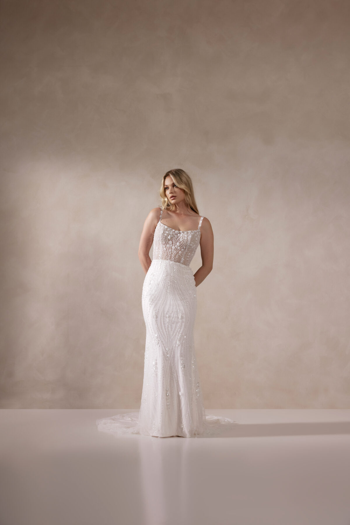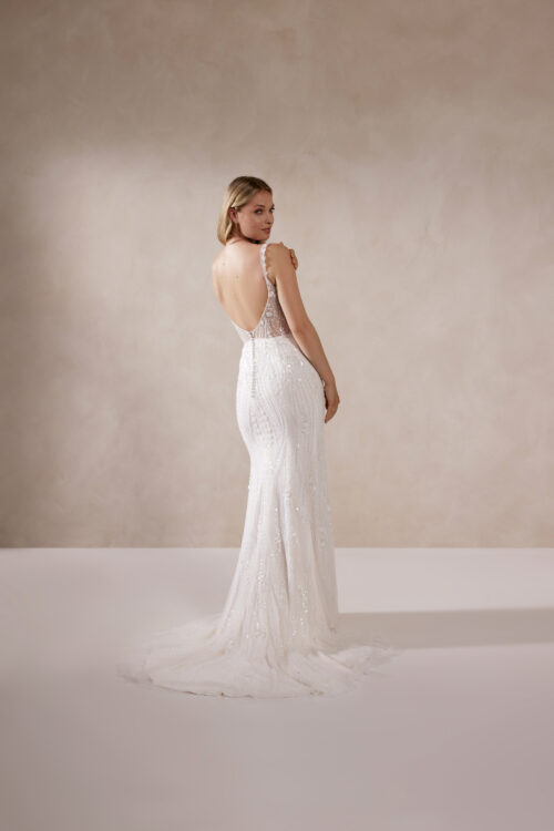 Το νυφικό είναι διακοσμημένο εξολοκλήρου με κεντήματα από χάντρες, πέρλες, παγιέτες και τρισδιάστατα στοιχεία, που δημιουργούν ένα μαγευτικό παιχνίδι φωτός. Το τούλι αγκαλιάζει το σώμα με φίνα υφή, ενώ η ουρά τύπου Chapel ολοκληρώνει το look με αριστοκρατική μεγαλοπρέπεια.