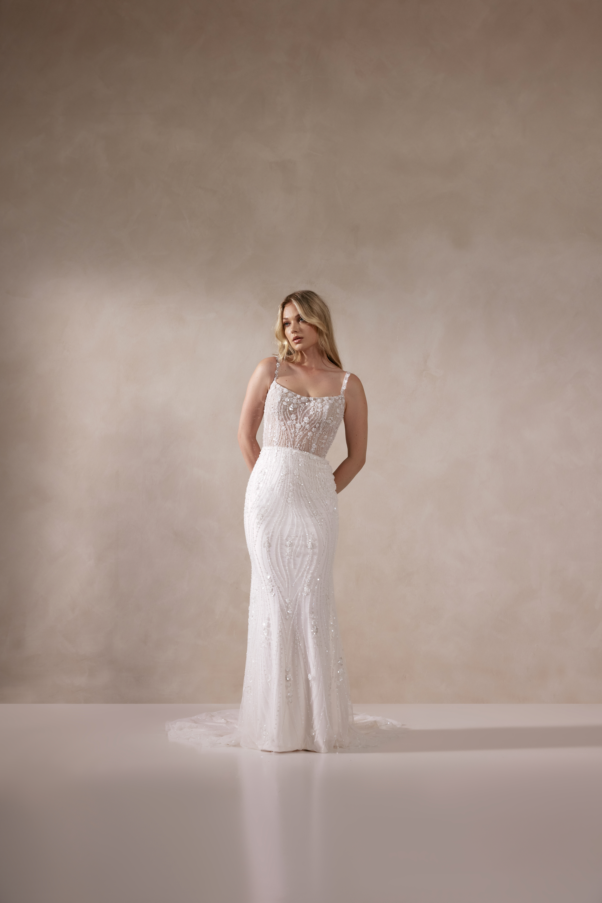 Το Lux είναι ένα νυφικό που ακτινοβολεί λάμψη και πολυτέλεια σε κάθε λεπτομέρεια. Η γραμμή fit & flare αγκαλιάζει τη σιλουέτα και ανοίγει κομψά στο κάτω μέρος, προσφέροντας θηλυκότητα και κίνηση. Η scoop λαιμόκοψη με plunge αισθητική δίνει έναν σαγηνευτικό και ρομαντικό χαρακτήρα.
