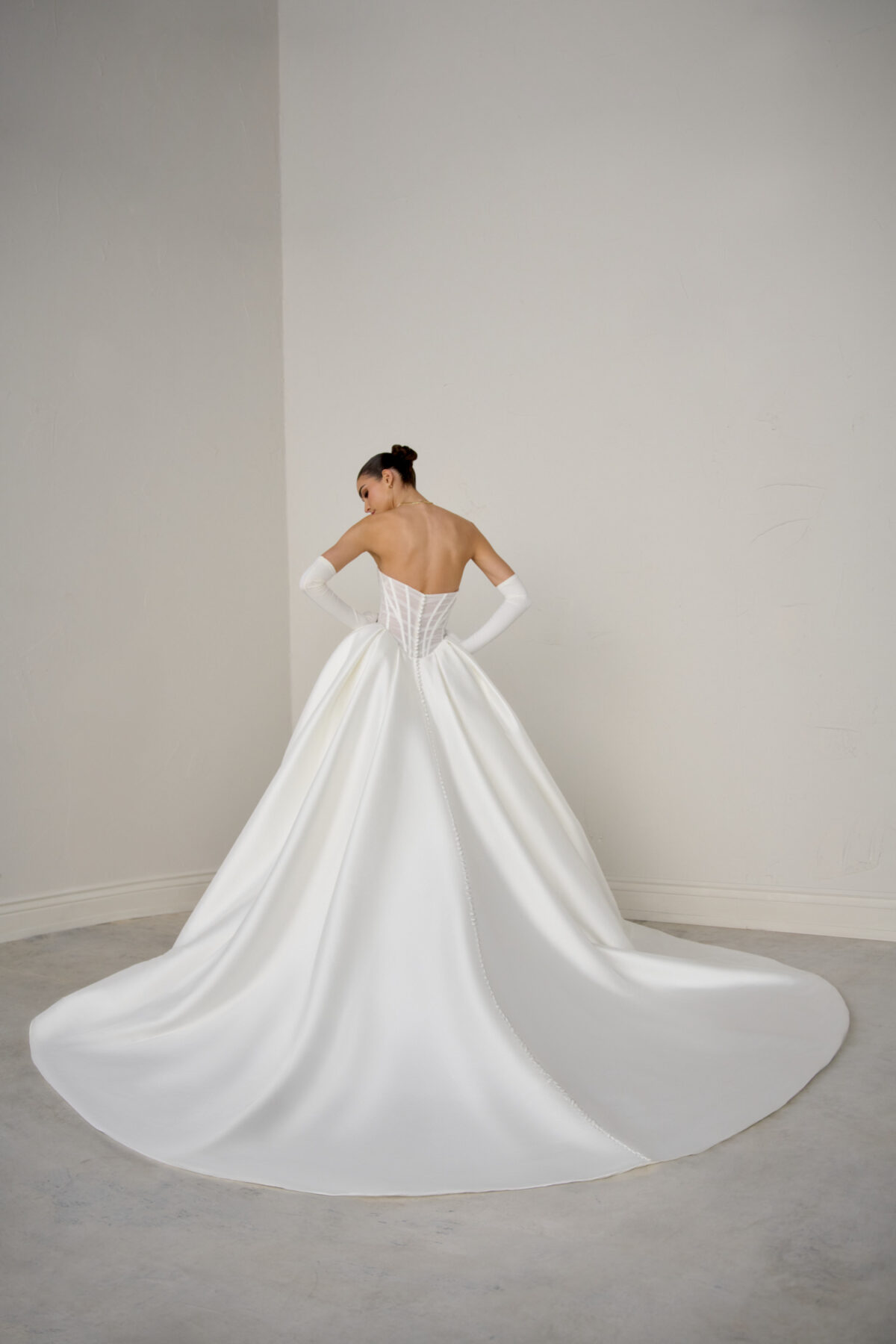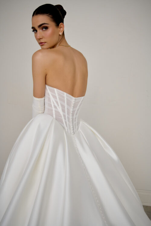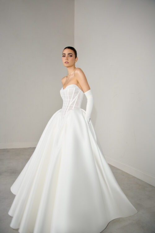 Η Sweetheart λαιμόκοψη χαρίζει ρομαντική ισορροπία στο δυναμικό κορσάζ, ενώ το πολυτελές ύφασμα από Stretch Mikado προσδίδει δομή και απαλή λάμψη. Το χρώμα Ivory/Latte δημιουργεί μια διακριτική αντίθεση, αναδεικνύοντας τη λεπτομέρεια και τη ραπτική δεξιοτεχνία. Η ουρά τύπου Chapel ολοκληρώνει το look με αριστοκρατικό μεγαλείο.