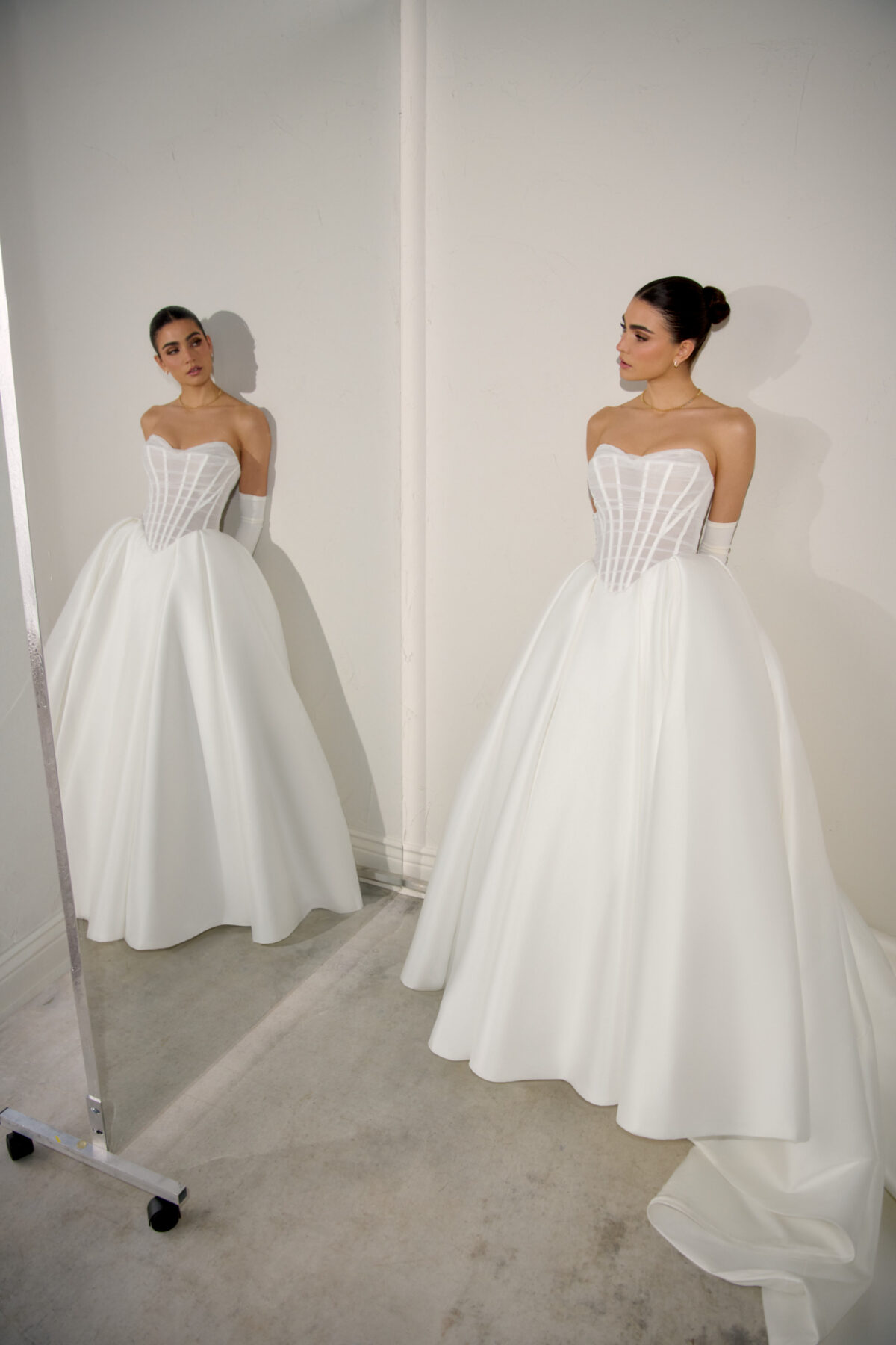 Ένα νυφικό που ενσαρκώνει τη σύγχρονη βασιλική κομψότητα — για τη νύφη που θέλει να συνδυάσει τη φινέτσα με τη δύναμη του στυλ της.